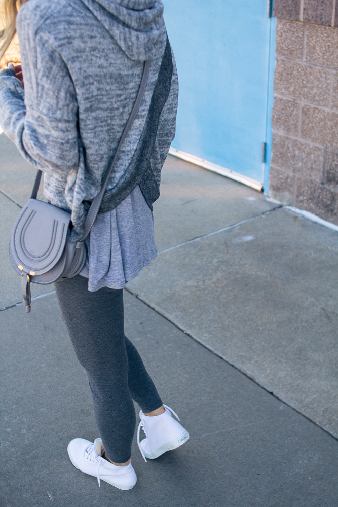 I love the cute open back detail on this super soft hoodie. I can throw it over my workout tank to and from gym or wear when I am lounging at home. These leggings pair great not only under a hoodie, but also under my oversized sweaters with sneakers. Right now I am white sneaker kick and these Startas high-tops are a fun twist on the norm. I just leave untied and slip right on and off for errands and running around with Sutton.